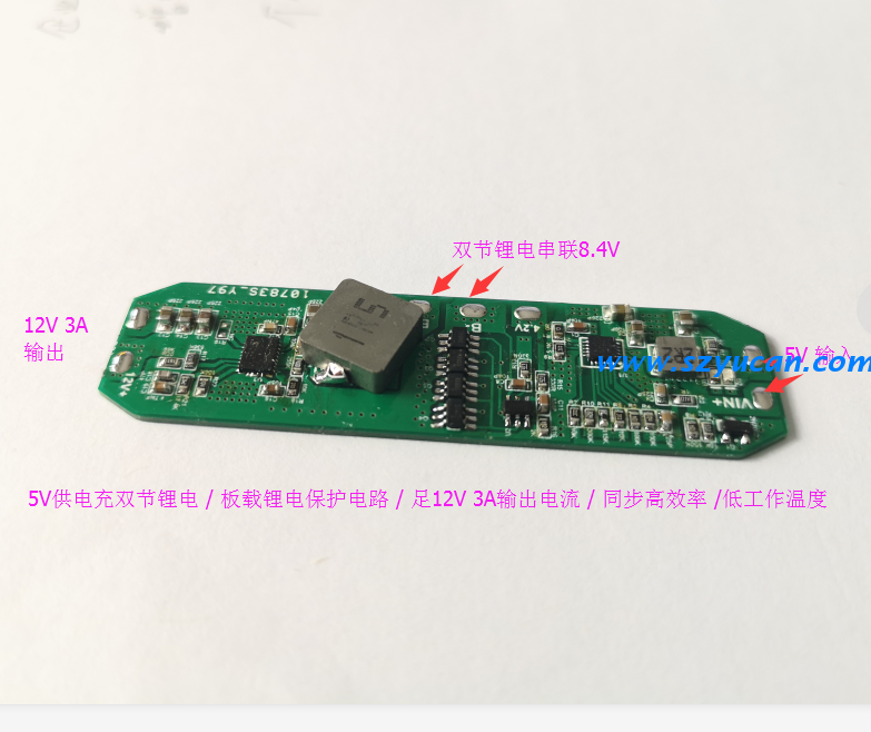 詳細信息5V輸入給雙節(jié)8.4V串聯(lián)鋰電充電+同步高效升壓輸出12V3A電源板PCBA...